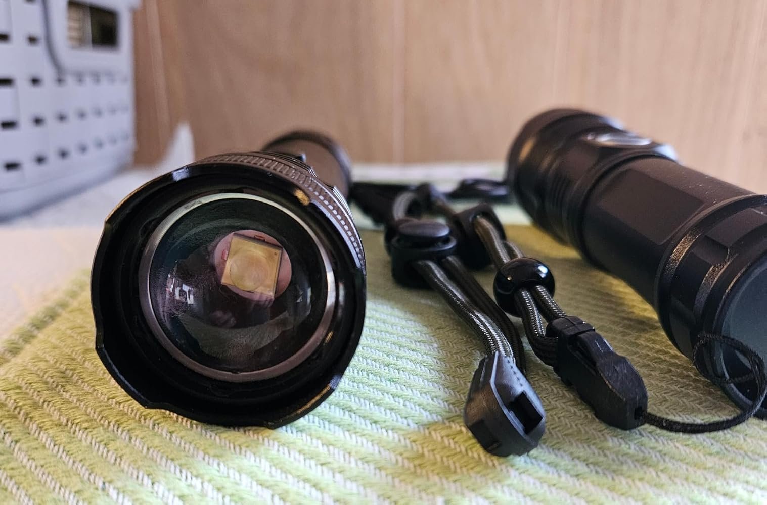 Over the last couple of years the world of flashlights has shifted from keeping enough batteries in stock to having the right charging cable. This is a great improvement, and much cheaper than constantly buying AA or AAA batteries (never mind those “C” and “D” batteries!)This pair of flashlights combines the best of both worlds: It comes with a large, rechargable battery unit, charges up on USB “C.” Any USB source will work, from a computer to a wall-wart charger, to a port in a car, to a spare battery — even another flashlight! (Because as it happens this sort of rechargeable flashlight also functions as a storage battery if you need to charge a phone — Or share a charge with a second flashlight!)Having said that it is conceivable that there may be an opportunity where there are no USBC cables or there are no USB sources but one has a drawer full of batteries still. Fortunately these flashlights come with an adapter into which you can slip three Triple-A batteries and run it like it was 1995.The flashlight has several useful features including a charge remaining indicator of four LED’s, way better than your typical disposable battery flashlight. It also has a certain amount of change of focus which makes the beam wider or narrower. Because of the way the beam projects the light has a very sharp edge almost like a stag spotlight. If you contract the light small enough it actually projects an image of the LED which is a white square with a black line across it, almost like the old X-ray machine targets they used to have common also back in 1995. :-DThe light cycles through very bright bright medium bright and low, has a disturbingly irritating flashing mode (I suppose it would be useful for disorienting bears, or muggers or Or signaling to the space aliens or rescue helicopter to pick you up). It also has the typical mode where it will flash S.O.S. in Morse code — Not sure who can read Morse code these days, but at least you won’t accidentally send “O.S.O” by confusing which letter is ” – – -” and which is ” . . .”.Long press turns the unit off.These are not as small as some, and may not be super comfortable jangling around in a pocket but they are smaller than the typical sea or D cell flashlight, and feel very solid and comfortable in the hand. They come with a wrist loop as well just to assure that you won’t drop it if you are scaling a rock face or changing a tire.Because these are big and robust, but come with a carry-on case, it’s a great set to keep in the car. There’s one for the driver and one for the passenger. We will probably keep these by the back door for use in the backyard and the basement at night, and so they can be grabbed easily in event of a power failure.Of course, only time will tell how long the battery will last and how well they will stand up to regular use, And if at some point in the future they stop functioning well, this review would be updated. If it has not been updated they still work fine.