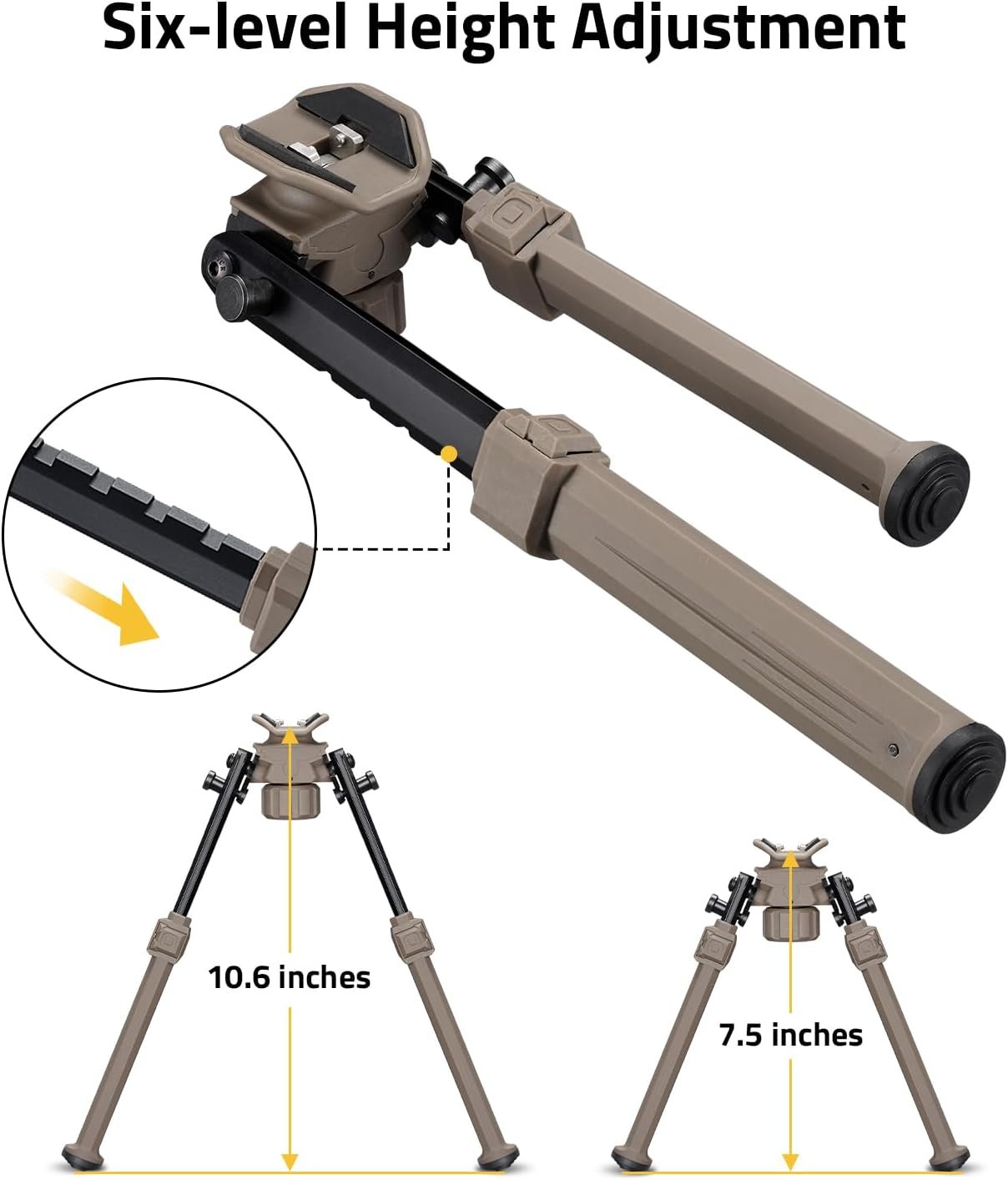 - 6-level Height Adjustment: The bipod’s compact size and folding capability also make it convenient for transportation and storage. The adjustable legs of the rifle bipod offer great versatility, from 7.5 to 10.6 inches