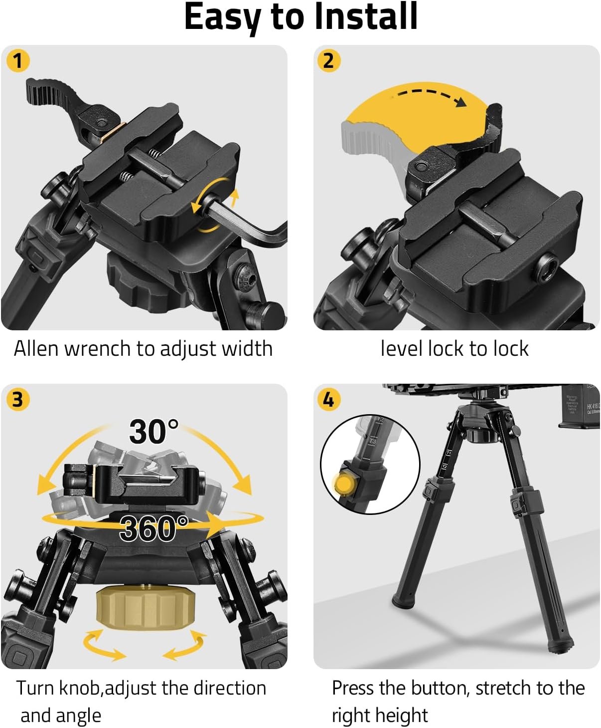 - Quick Release Design: The bipods for rifles provide a secure and reliable mounting solution. The installation process is straightforward, allowing for quick attachment and detachment as needed. Adjust the width and level lock to fit different Picatinny