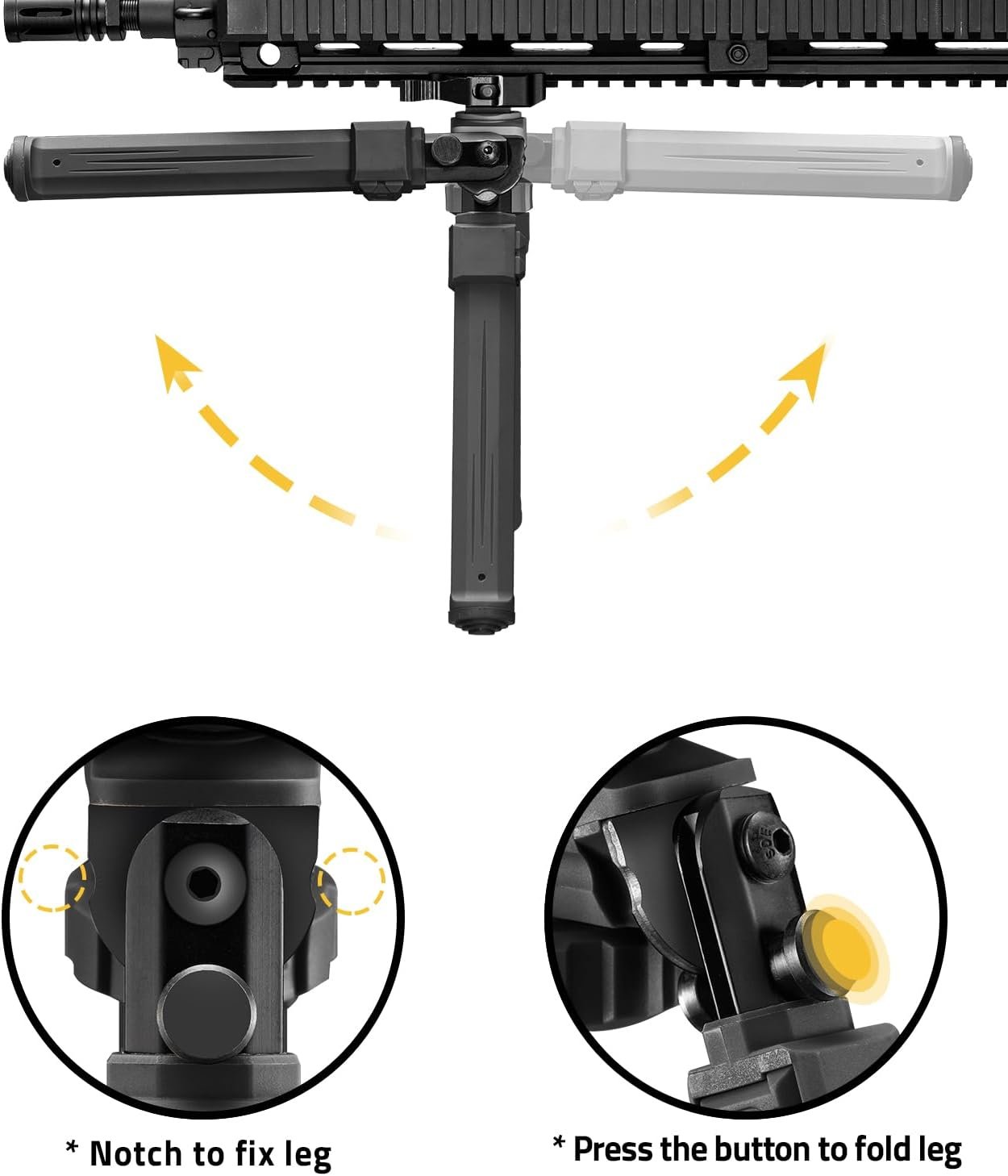 - Tilt & 360 Degrees Swivel Function: With the ability of the picatinny bipod to swivel left or right and 360° horizontal rotation, you can track moving targets or adjust your shooting angle with ease
