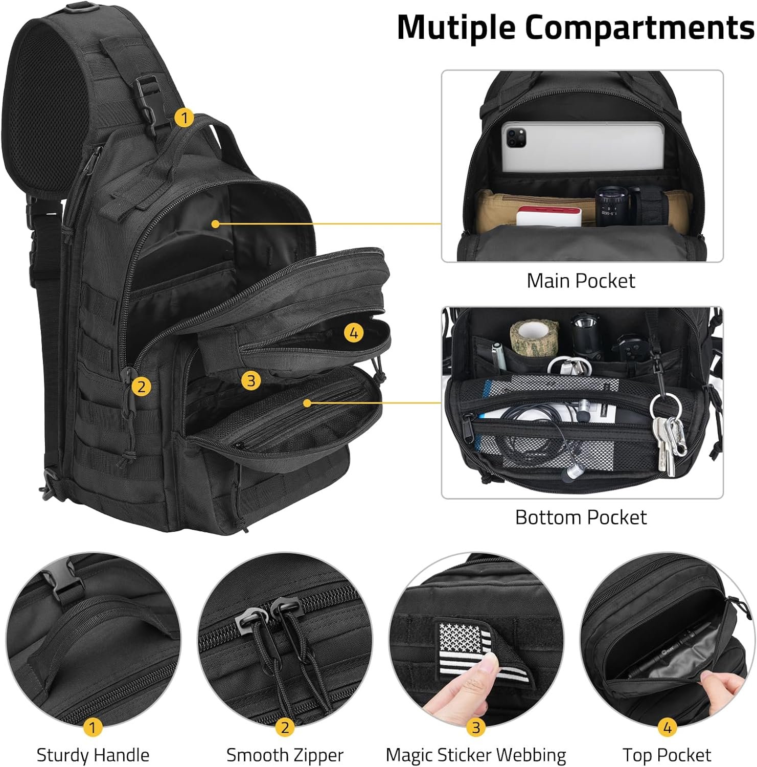 - Detachable Sling Day Bag: Tactical sling bag pack with 1 side detachable water bottle holder and 1 side detachable small tactical bag as a sling day pack or every day carry bag.(Tips: Bottle not included.) 2 front pockets with several inter layer pockets can be enough placed and organized the small necessities like Pad, chargers, key, coins, tissues, snacks. It’s made of sturdy and lightweight 900*600D polyester. Double-stitching for heavy-duty zippers, to make them last for a long time.