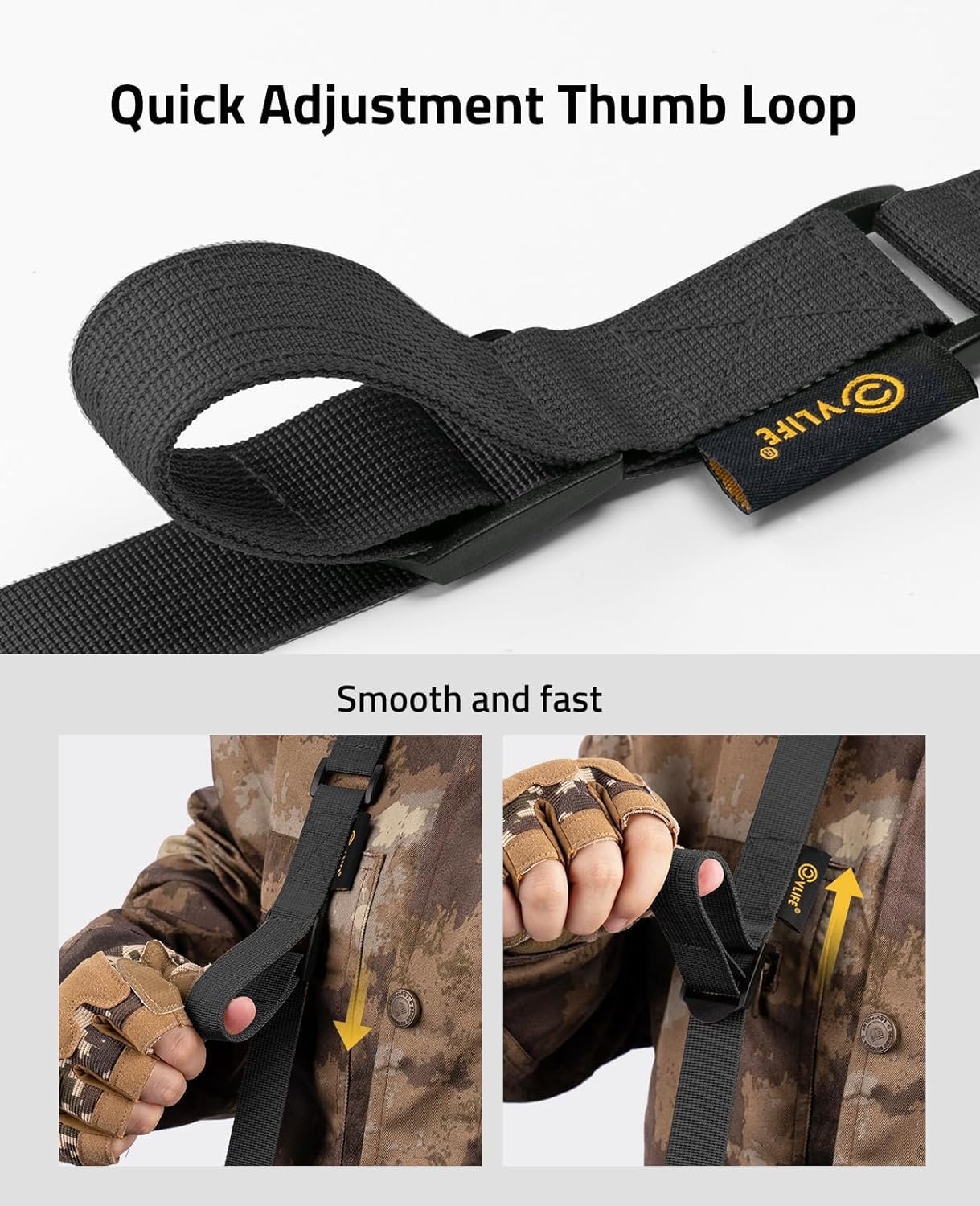 - Quick Length Adjustment: This rifle sling can quickly adjust the length by the front thumb loop. You can easily adjust the two point sling length with one hand, the length of the pad rifle sling can be adjusted from 47″ to 68“