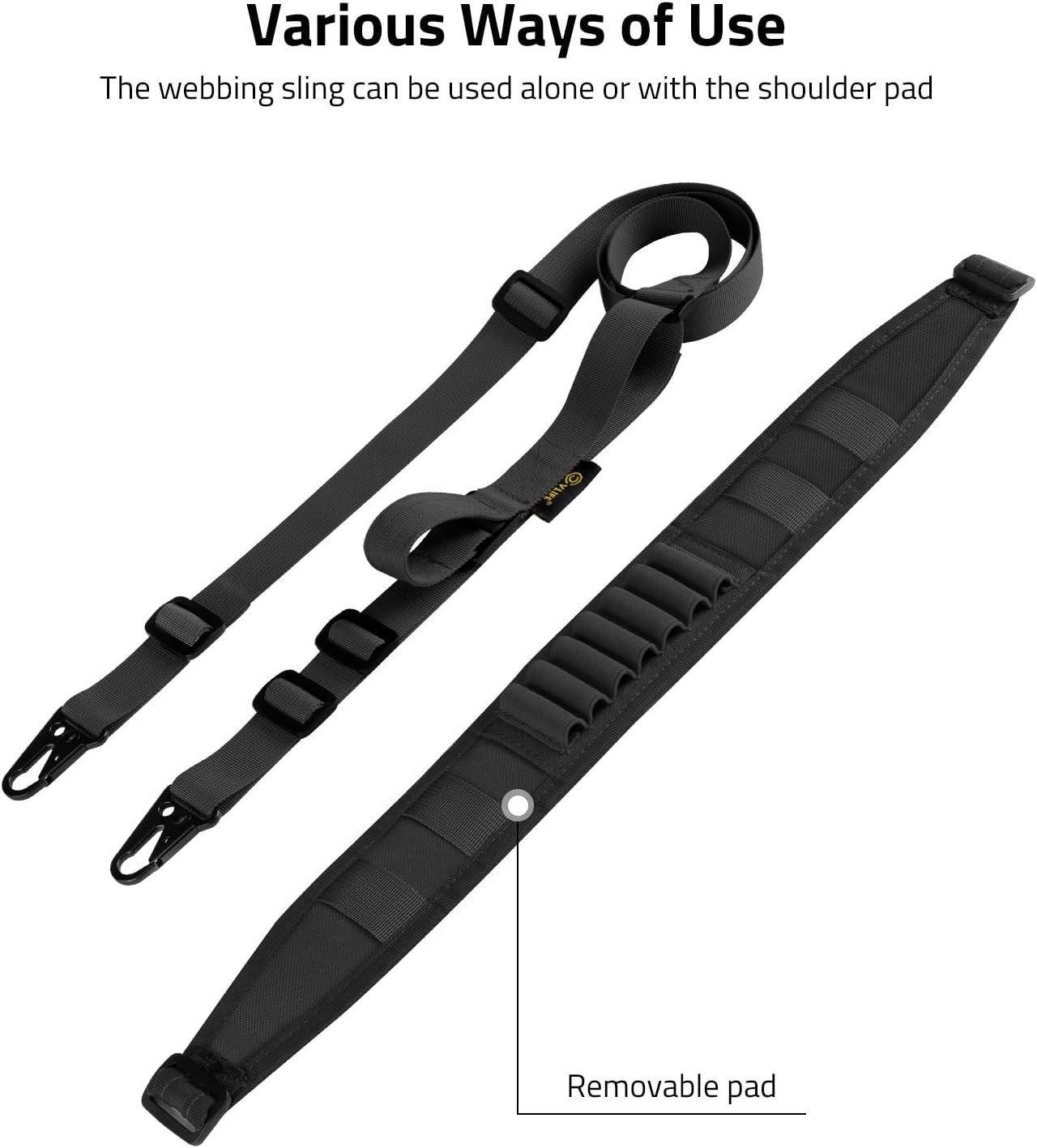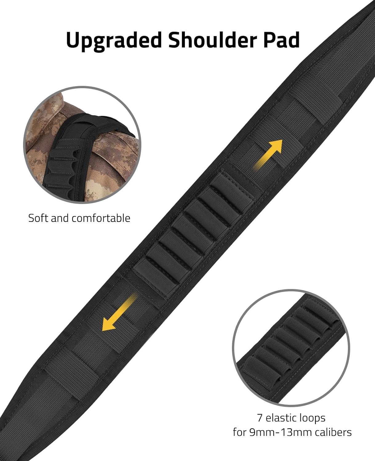 - Removable Shoulder Pad: The shoulder pad of the two point sling is removable, the webbing sling can be used alone or with the widened shoulder pad. The elastic loops securely hold 7 rounds of 9mm-13mm calibers for easy access at any time during outdoor activities