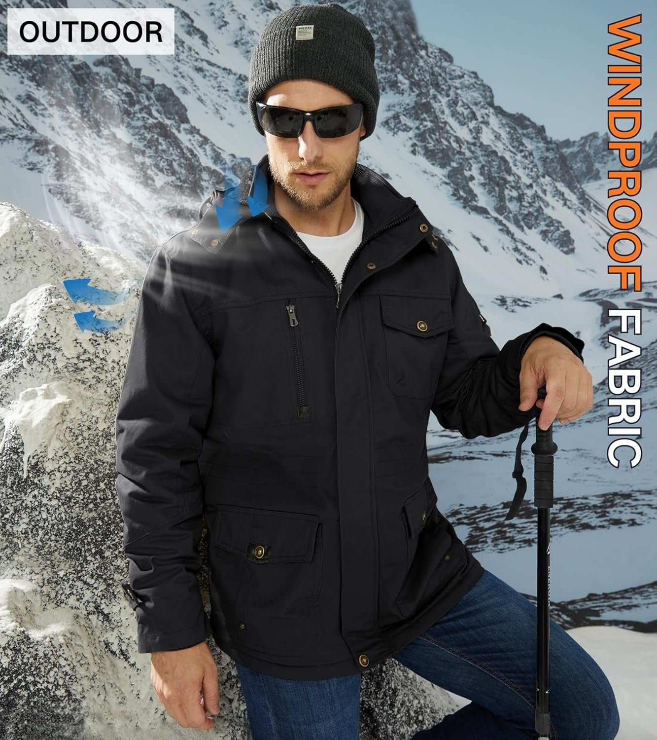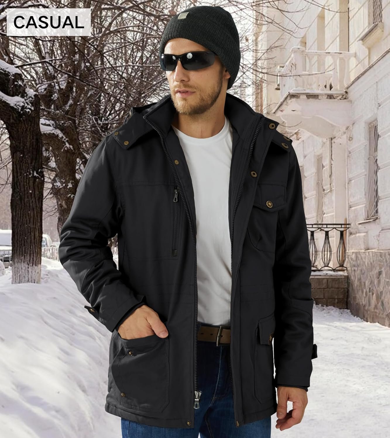 - Windproof: The men’s cargo jacket has a large detachable hood, adjustable buttons on the cuffs and collar to protect against the cold wind in winter