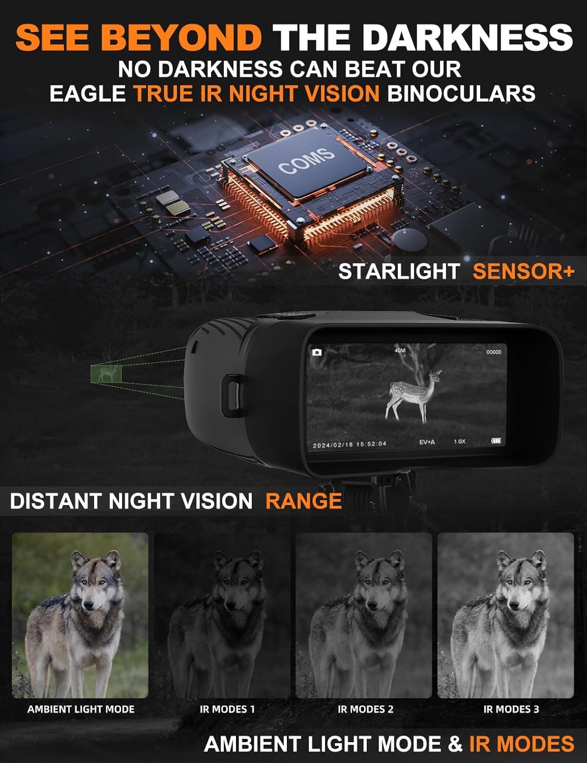 - Immersive Viewing – See the night like never before with the immersive, large-screen design of our night vision binoculars for adults. With 40MP image quality and 4K video resolution, you can capture every moment with stunning clarity—whether you’re scouting for game, birdwatching, or even documenting your night fishing trips.