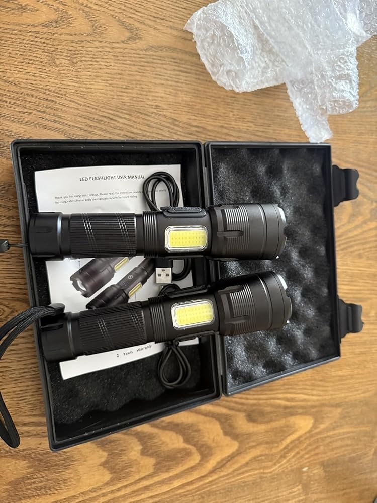 The rechargeable battery makes it convenient for regular use, and it lasts a really long time on a single charge, much better than flashlights that require disposable batteries. With seven different modes, it’s suitable for different situations. It’s incredibly bright, even brighter than a car headlight when adjusted to the highest setting. I keep one in my car, and I believe it could be useful in emergency situations. I also have one at home, and it’s a great option during power outages.
